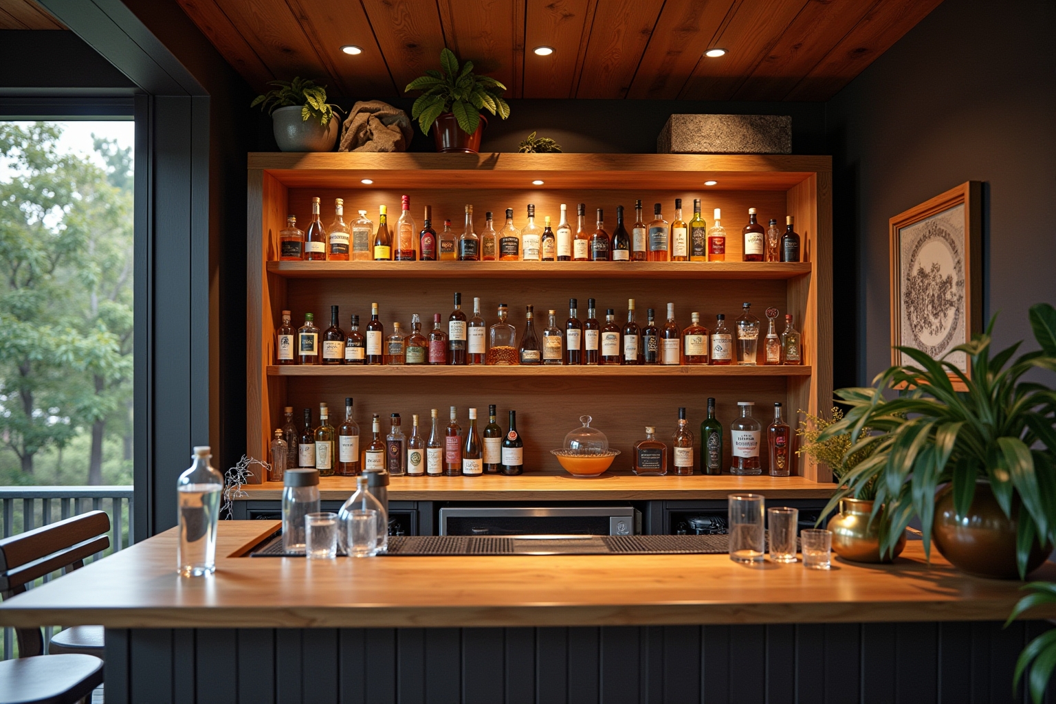 Die wichtigsten Elemente einer funktionalen Heimbar sind eine stabile Arbeitsfläche, ausreichend Stauraum für Gläser und Flaschen sowie eine angemessene Beleuchtung.