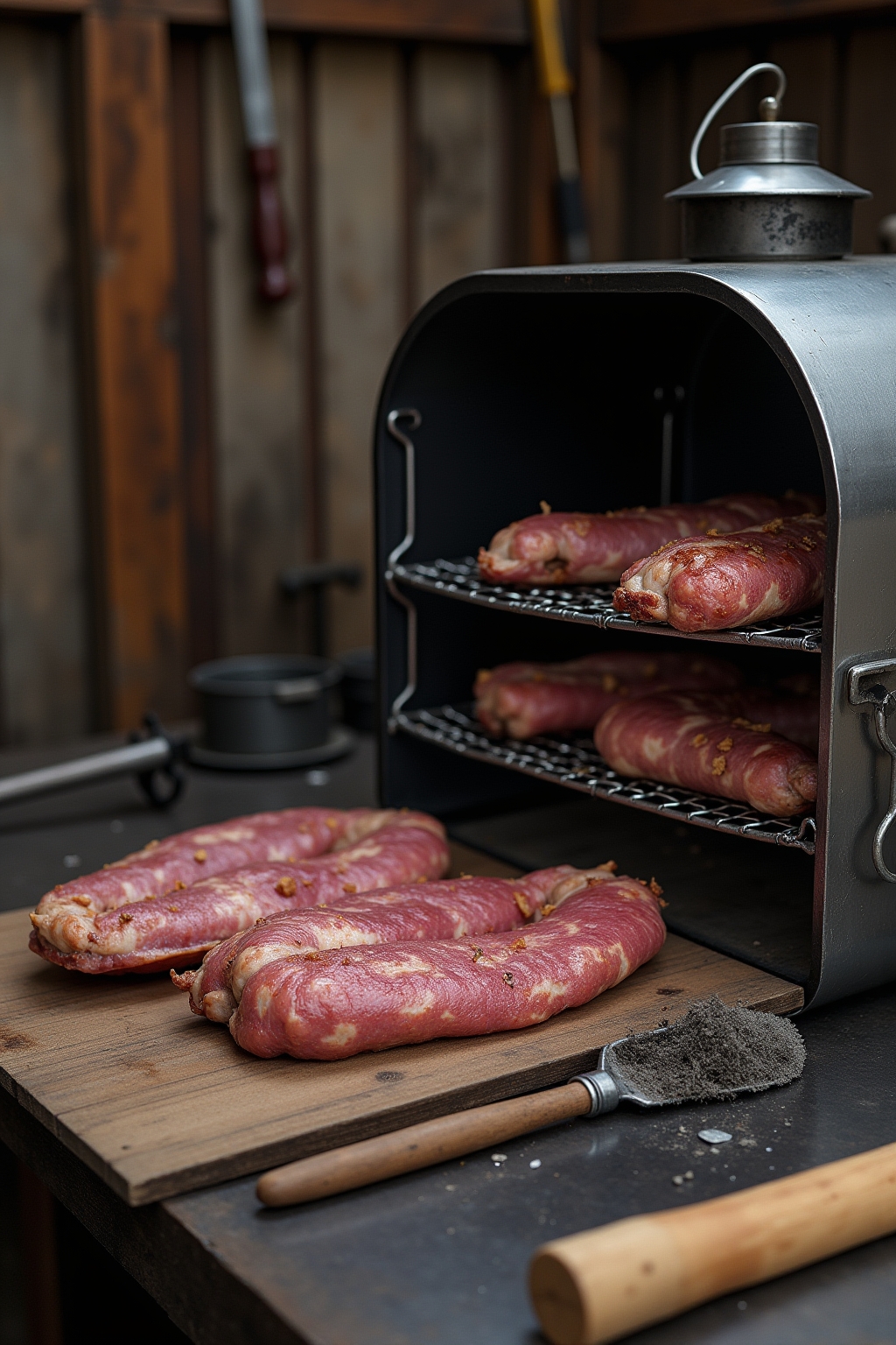 Beim Kalträuchern im selbstgebauten Rauchschrank bleibt die Temperatur zwischen 15°C und maximal 28°C. Der Prozess beginnt mit dem korrekten Pökeln des Räucherguts, meist durch Trockenpökeln oder Lake. Nach dem Durchsalzen und einer Ruhezeit wird das Produkt zum Trocknen aufgehängt, bis sich eine leicht klebrige Oberfläche (Pellicle) bildet – ein entscheidender Schritt für die Rauchaufnahme. Im Räucherapparat wird dann Rauch durch das langsame Glimmen von Räuchermehl oder Spänen erzeugt, nicht durch offene Flammen. Der Rauch zieht durch die Smokerkammer, während das Räuchergut bis zu mehrere Tage oder sogar Wochen veredelt wird. Diese schonende Konservierungsmethode verleiht Schinken, Speck und Würsten ihr charakteristisches Aroma und ihre lange Haltbarkeit.